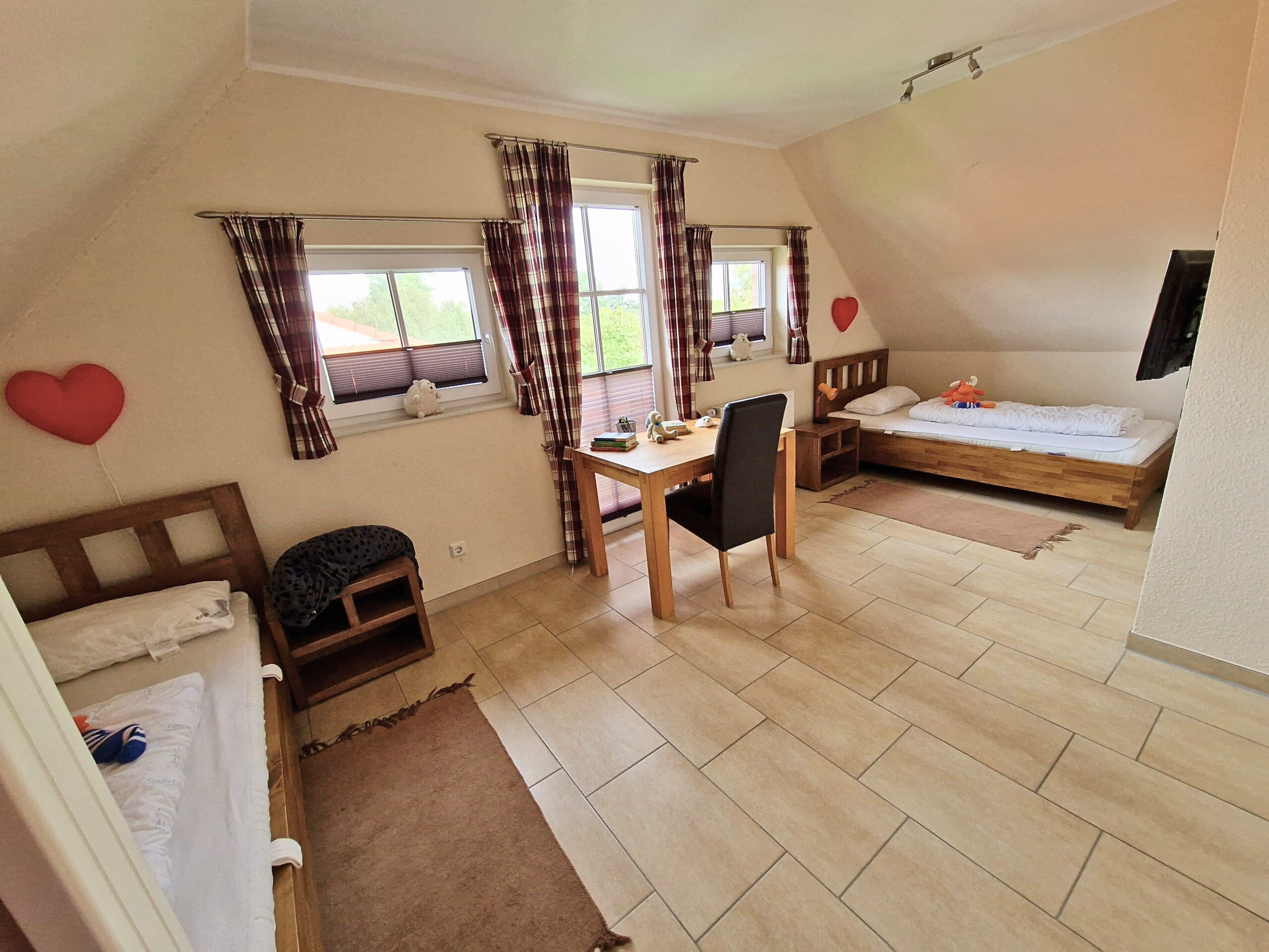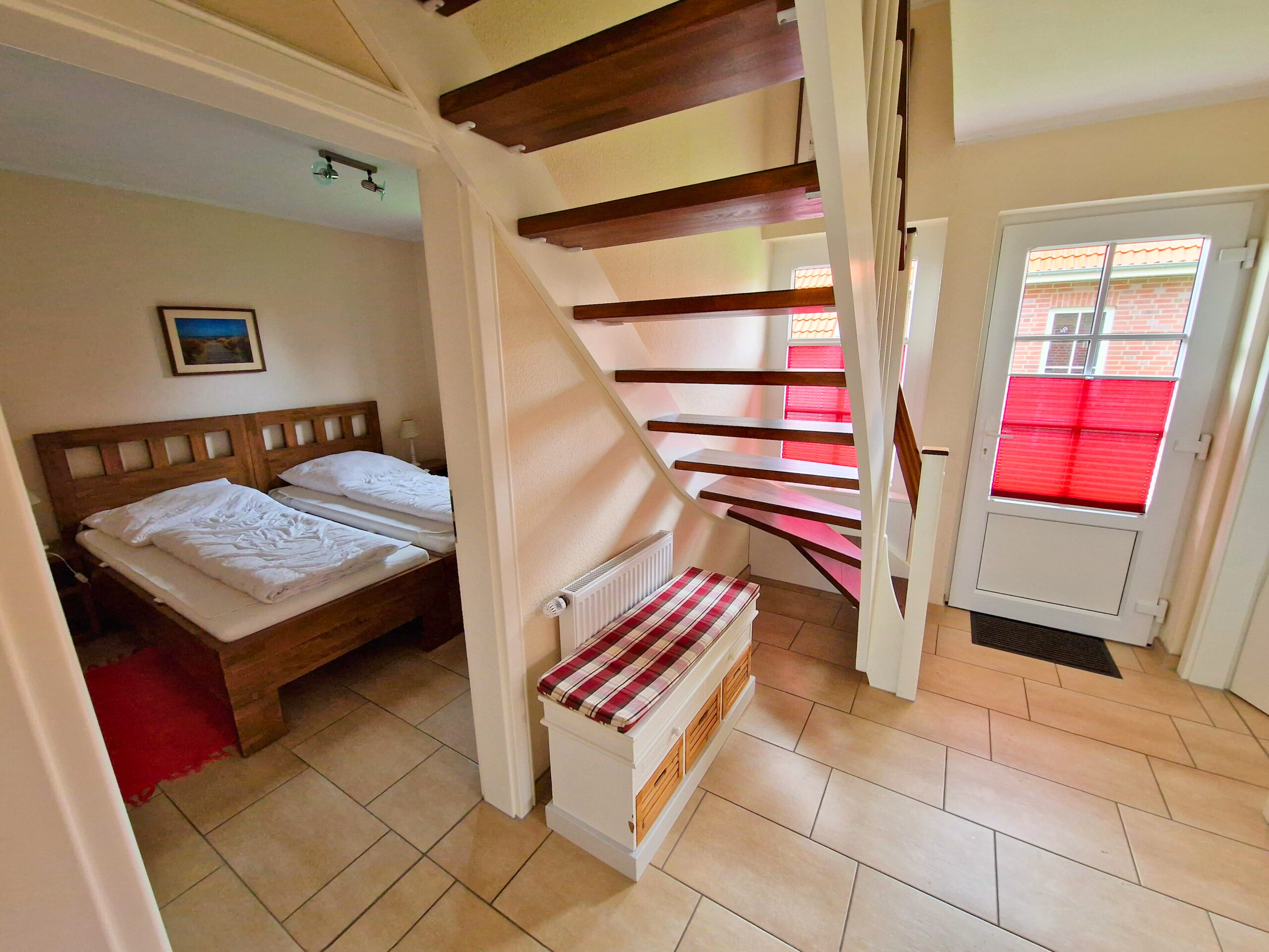 Über die Holztreppe im Flur gelangen Sie in das Obergeschoss des Hauses. Hier befinden sich zwei weitere Schlafzimmer: ein Kinderzimmer mit zwei Einzelbetten und einem kleinen Schreibtisch, sowie ein Schlafzimmer mit Doppelbett und einer Kommode.