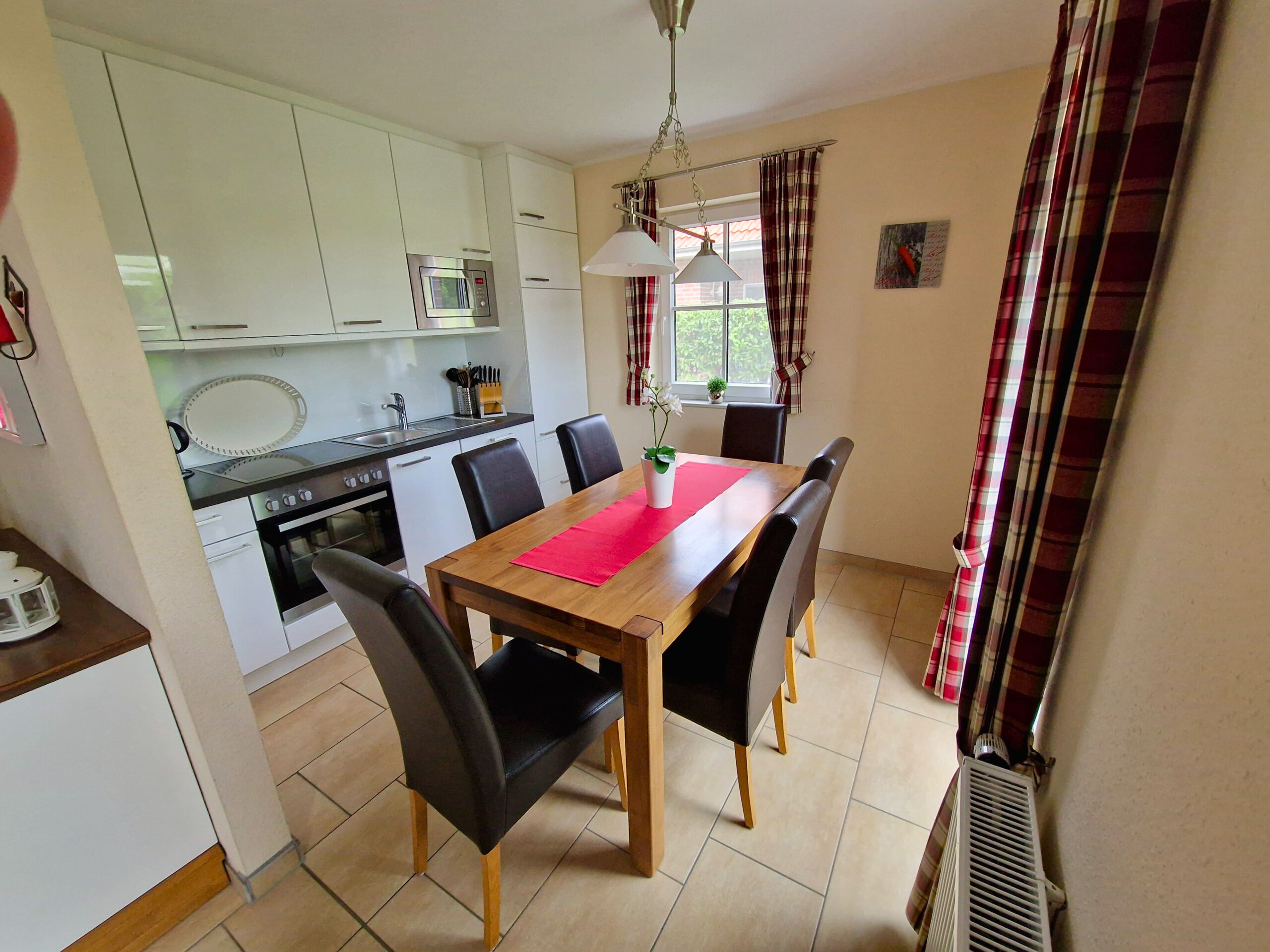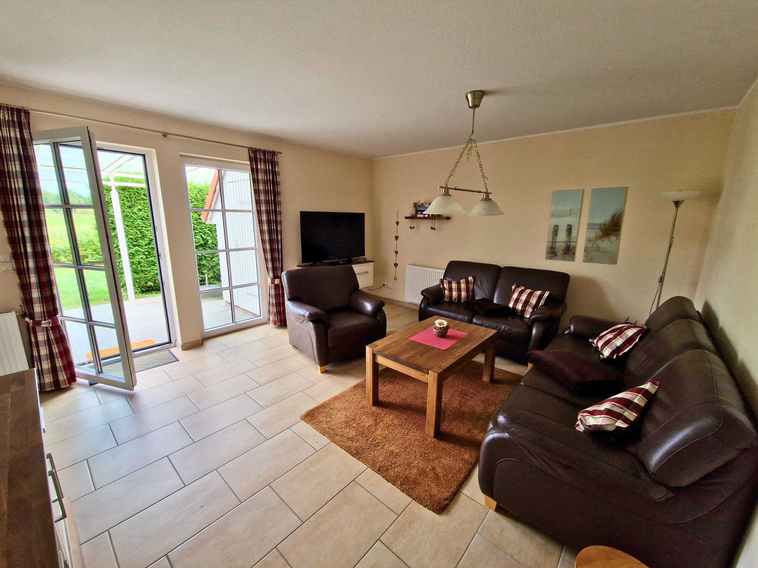 Das Ferienhaus bietet auf 91m² ausreichend Platz für bis zu sechs Erwachsene und einem Kleinkind bis 2 Jahre. Sie gelangen über einen privaten Eingang in das Haus, wo sich gleich auf der linken Seite das erste Badezimmer mit ebenerdiger Dusche, WC und Waschbecken befindet. Gegenüber, unter einer Holztreppe, liegt das erste Schlafzimmer mit zwei Einzel- oder einem Doppelbett. Der großzügige Wohnraum empfängt Sie mit komfortablen Sitzmöglichkeiten, einem Schrank, einem Radio und einem Flat-TV. Direkt an dem Wohnzimmer liegt die offene, vollständig ausgestattete Küche mit einem massiven Esstisch. Von hier und vom Wohnzimmer können Sie auf Ihre privaten und möblierte Terrasse treten.